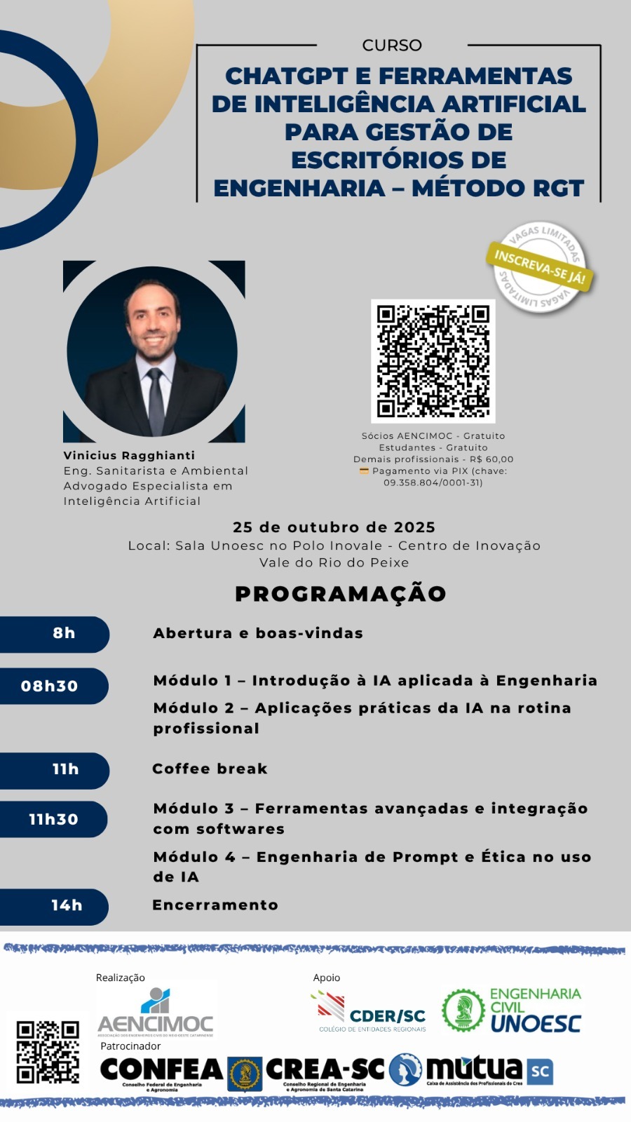 No dia 25 de outubro, das 8h às 14h , a AENCIMOC promove o curso “CHAT GPT e as ferramentas de IA para gestão de escritórios de engenharia”, com Engenheiro Vinicius Raguianti